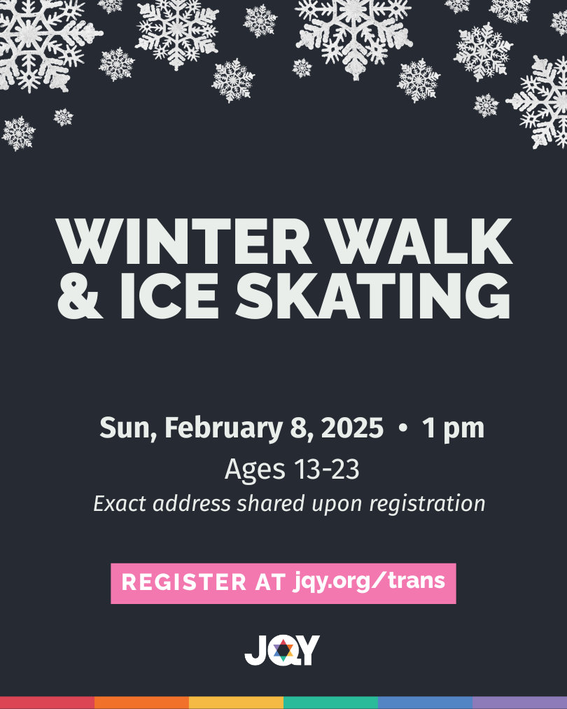 Winter means ice skating with JQY! Whether you love to zoom around the rink, or inch forward clutching the side railing, we want you there! Gliding on the ice is always better with friends by your side. We will be joined by Queer Femme Hockey player extraordinaire, Simone, who will show us how to gain confidence on the ice.