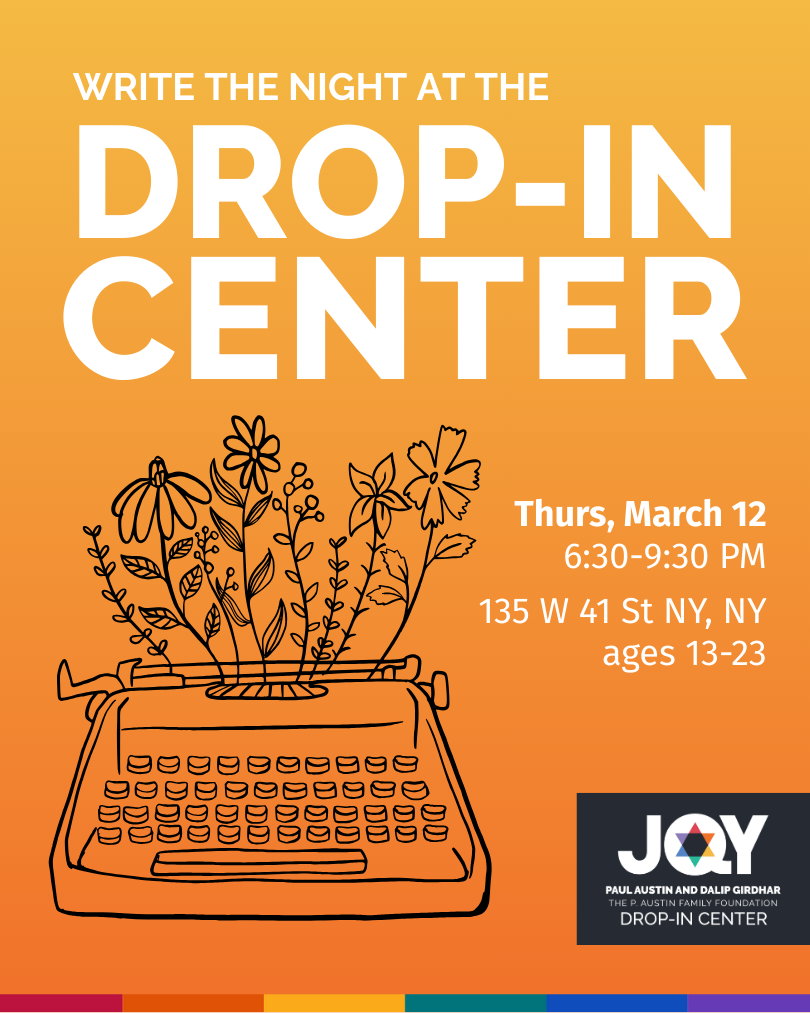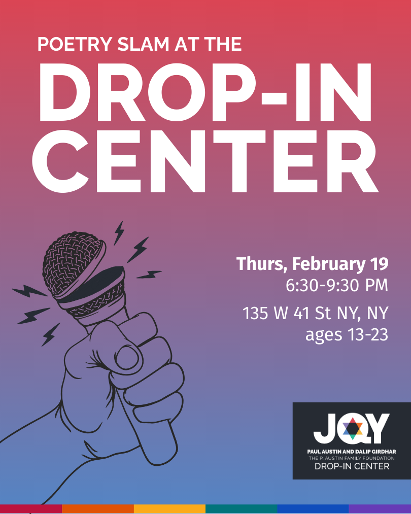 --------------------Join us in-person from 6:30pm-9:30pm EST at our WeWork building at 135 w 41st street.No need to register for Drop-in Center, just show up! We’ll have plenty of pizza and icebreaker games to go around. For anyone ages 13-23.If you need assistance with transportation to Drop-in, please apply at jqy.org/travelrequest