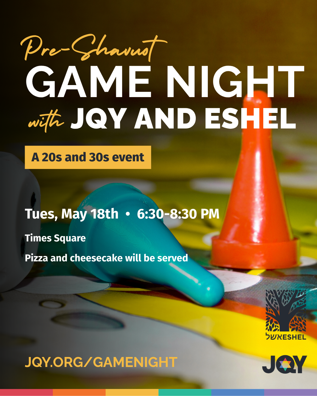 Join JQY and Eshel for pre-Shavuot 20s and 30s game night! We’ll have time to schmooze, eat some cheesecake, and play games. Dinner (pizza) will be served.This event is for […]